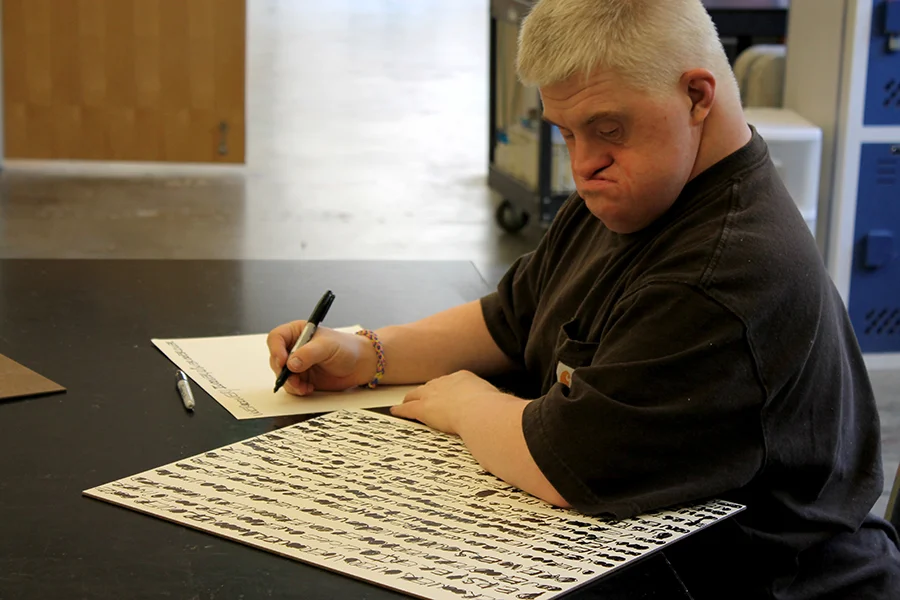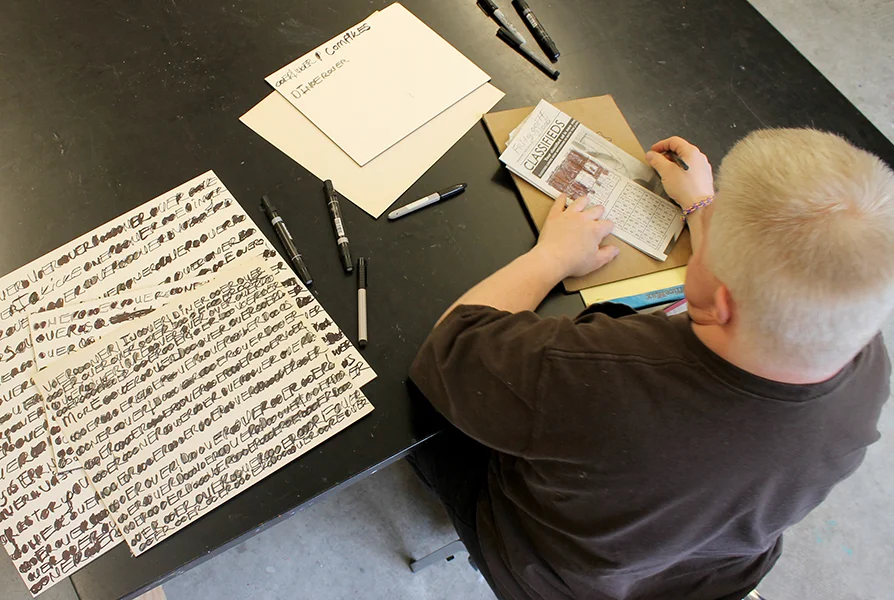 Over the course of working in and researching progressive art studios, we’ve encountered many artists who brilliantly incorporate text into their work: the narratives of Oscar Azmitia, rules and records of William Tyler, Daniel Green’s stream of consciousness lists, among many others. Text is usually employed in creative pursuits because it’s the paramount mode of expression in their lives and there’s often no separation between studio practice and daily life. This tendency may be the result of art-making as the most significant form of communication for these artists - a disposition which many artists lay claim to, but few truly experience in such a literal and profound way.